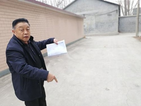(金树忠手持勘测定界图在涉案大棚原址、向记者讲述相关情况)