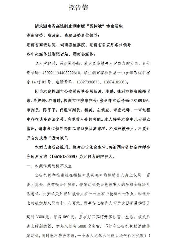 本人尹和兵,系涉嫌抢劫、放火冤案被告人尹自力的父亲,身份证号码:430221194408222610,家住湖南省株洲县平山乡华石煤矿宿舍14栋03号,电话号码;13327338673,13874182063。