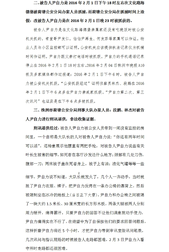 被告人尹自力是在文化路海德堡亲属家还没有吃晚饭时被公安机关抓的,有堂哥尹友仁,伯伯尹再生、何友芬等家属可以作证。物业人员与小区监控都可以证明,公安机关应该提供执法记录仪为抓捕时间作证明。尹自力跟父亲打电话时被抓获,尹自力的手机通话记录停止在2016年2月1日18时左右。2016年2月04日株洲市晚报A10板及多家媒体都作过报道:2016年2月1日下午6时,被告人尹自力被公安机关抓获。“公安抓获经过”证明侦察员林杰、段鹏在2016年2月1日下午6点多在尹自力亲戚家抓获。“尹自力第二次、第三次讯问”也证实是在下午6点多被抓获。