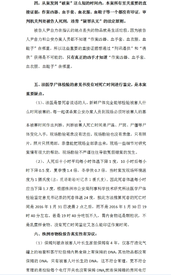 (2)、人死后十小时平均每小时体温下降1度,10小时后每小时下降0.5度,夏季慢1.4倍,冬季快0.7倍,当时案发现场环境温度为1摄氏度(注:现场勘验时记录1摄氏度),因此死者体温每小时应当下降1.7度。根据株洲市公安局刑事科学技术研究所法医学尸体检验鉴定意见书记录的死者体温24度,按此方法推算死者的死亡时间是2016年1月31日凌晨2点之后,而不是2016年1月30日19时40分左右。若是19时40分吃饭不久,胃内食物还是颗粒状,不是乳糜样食物。没有死亡时间鉴定又怎么能印证作案时间。