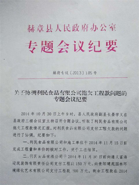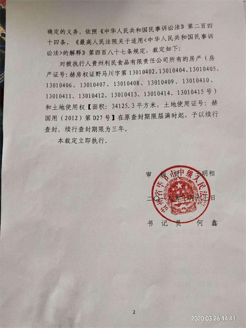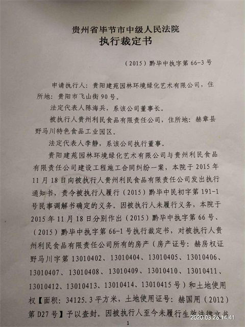 在漫长8年的讨薪路中,我们一直期盼贵州利民食品厂拍卖后能有钱支付我们的工钱,谁知道,贵阳市中级人民法院执行局把这价值上亿的贵州利民食品厂以一千多万元就拍卖处置完了(部分超低价 拍卖,部分以物抵债)。让我们这些农民工的血汗钱彻底陷入了绝望。于是,我们就去找到当时承接该厂部分工程的贵阳建苑园林环境绿化艺术有限公司负责人何永镜了解情况,何永镜告诉我们,说关于贵州利民食 品有限责任公司欠他们公司600多万元工程款一事,他们公司已在2015年已把该公司起诉到了毕节市中级人民法院,该法院在2015年11月2日的调解书生效后,由于该公司未履行付款义务,在2015年11月18日又依法向 法院申请对该公司位于赫章县野马川镇的该厂房的土地使用权证,赫国用(2012)第D27号,面积:34125.3平方米,房产证号:赫房权证野马川字第13010402、13010404、13040405、13010406、13010407、13010408 、13010409、13010410、13010411、13010412、13010413、13010414、13010415号依法查封了。目前以上资产毕节市中级人民法院还处于查封期间,他们未收到任何拍卖信息,也未有过任何单位和个人找过他们商量 厂房拍卖事项。也是看到腾房公告后才知他们查封的厂房已被贵阳市中级人民法院执行局拍卖了,现正与毕节市中级人民法院对接中。