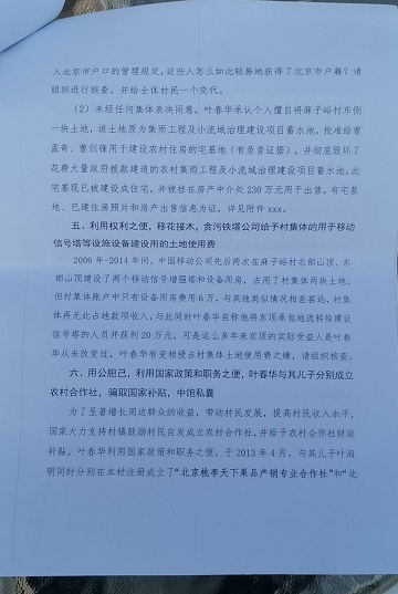 (1)叶春华滥用职权、收受贿赂,欺骗公安机关,为山西户籍曹剑锋、曹孟奇等2人获取了麻子峪村村民户口(北京户籍),这些人均与麻子峪村民无任何亲属关系,可以说毫无想干和瓜葛的人。 村民就这些人如何获得本村村民身份提出了质疑,叶春华回应称每个户口收取了5000元管理费共计1万元,也就是说只用1万元,此2人就获得了北京市户籍。何为管理费,为什么收取管理费,北京市户政管理条例没 有收取管理费就入北京市户口的管理规定,这些人怎么如此轻易地获得了北京市户籍?请组织进行核查,并给全体村民一个交代。