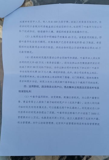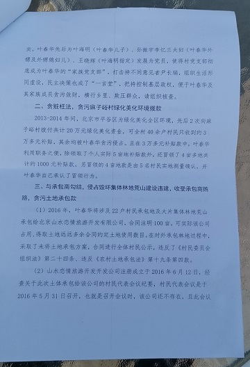 (4)经本村村民强烈要求公开合同细节和调查,叶春华本人承认除合同约定之外45万元(有录音证据),还与北京山水恋情旅游开发公司达成了共计30万元私下协议,为什么除合同外存有私下协议 存?叶春华存在收取好处费30万元之嫌,请组织核查。此外,该公司在承包土地后,违法毁坏林木,在山坡林地上违法构造了围墙、大门等建筑。毁林违建有录音和照片为证,村民3次向上级反映叶春华给出3个截然 不同的结果。