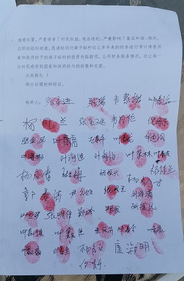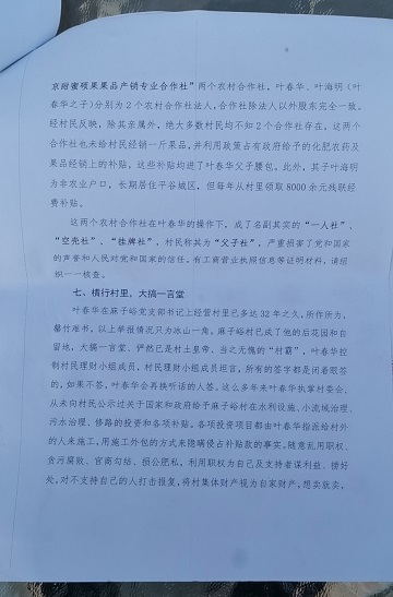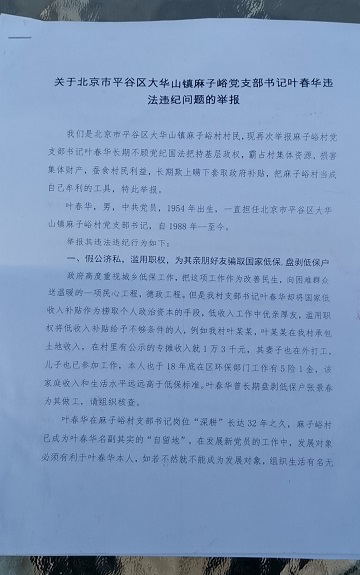 我们是北京市平谷区大华山镇麻子峪村村民,现再次举报麻子峪村党支部书记叶春华长期不顾党纪国法把持基层政权,霸占村集体资源,损害集体财产,蚕食村民利益,长期欺上瞒下套取政府补贴
