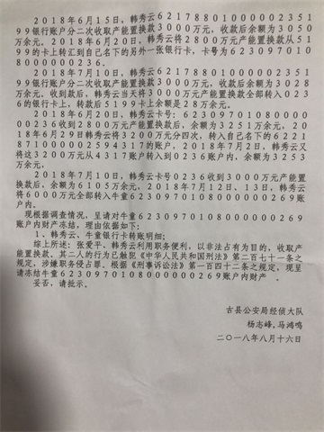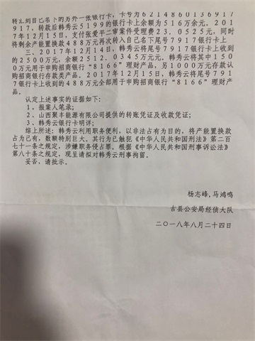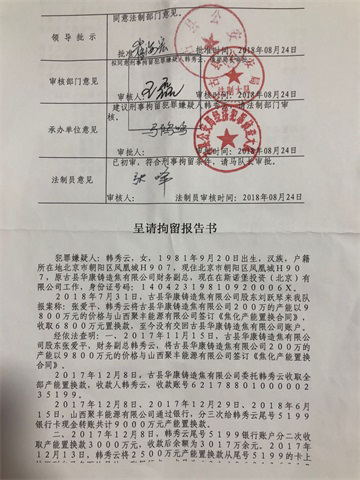 其三,崔海宏、马鸿鸣二人对本人进行刑拘时,仅凭诬告陷害者刘跃琴的唯一 “报案人笔录”,此二人根本不在乎2014年以后韩秀云在华康公司不担任任何职务,他们为达目的,不 择手段。《呈请拘留报告书》中描述到韩秀云利用职务之便,以非法占有为目的,将产能置换款占为己有的立案依据有三点:1:报案人笔录;2:聚丰能源有限公司转账凭证及收款凭证:3:韩秀云银行卡明详。那么韩秀 云的华康公司财务副总身份崔海宏和马鸿鸣是如何认定的?难道仅凭小三刘跃琴和冒充华康公司法定代表人的高志飞的口头诬陷吗?为防小三刘跃琴反咬一口,诬告陷害,大股东张爱平公证送达,公证召开股东会, 难道还不够证明其光明正大,坦坦荡荡处理华康公司各项事务的良苦用心吗?何来利用职务便利,以非法占有为目的啊?这分明就叫欲加之罪何患无词?崔海宏,马鸿鸣处心积虑掩盖事实,滥用职权,真可谓狼狈为 奸、慌不择路。若不是古县检察院秉公执法,明察秋毫对我的案件作出不予批捕的决定,此二人犯罪阴谋险些得逞。