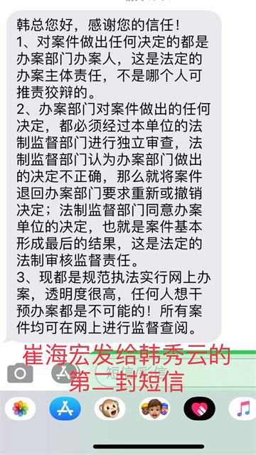 崔海宏副局长在第一次反映举报后的第三天(8月12日)下午1点23分,就直接给本人发短信:“韩总你好,近日在网上看到你发的帖子感到很震惊,不管你听了谁背后说了不负责任的坏话都 请你认真甄别,此事至始至终是非曲直这个你都很清楚的。至于个别人说领导说立案就立案,说不立案就不立案等等推卸责任的话。这只能说明这个人的法律意识和执法理念太淡薄了,他最起码连规范执法活动的基 本理念都没有!你应该清楚有些话是在推卸责任的,更是对他人的人身攻击。相信你我都不会听取小人口蜜腹剑之言违背自己良心去做伤天害理的事。”对崔海宏极力想撇清他自己,以及他们先制造冤假错 案,后又以“不予立案决定书”妄想掩盖刘跃琴、高志飞二人诬告陷害,谋财害命,及他们贪赃枉法、沆瀣一气的违法犯罪行为的短信被我揭穿后,崔海宏又于8月14日上午10点54分给本人发了第二次短信,其在短信中 竟然大言不惭、厚颜无耻地谈道: