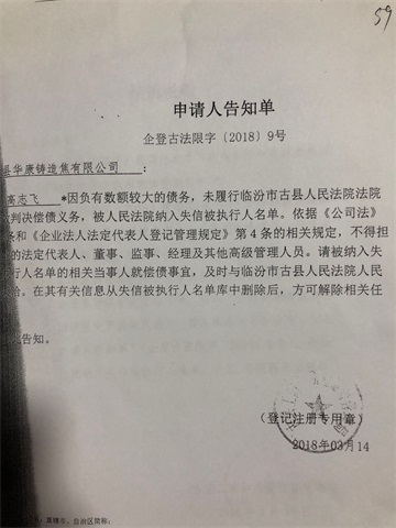 三、为什么古县公安局在收到华康公司罢免高志飞法人代表的股东决议,及两份人民法院认定、判令华康公司股东决议合法有效的判决书后,仍胆大妄为给高志飞非法刻制华康公司的公章?早在 2018年3月19日古县工商和质量监督管理局就以公函的形式告知古县人民法院“古县华康铸造焦有限公司曾向我局提出变更登记。在山西工商综合业务管理系统受理环节,高志飞因其拒绝履行古县人民法院生效判决被 法院纳入失信被执行人导致系统再无法操作。”而古县公安局2018年11月5日还公然给欠债不还的高志飞刻制公章,古县公安局插手华康公司经济的狼子野心昭然若揭。依据《公司法》和《华康公司章程》华康公司有 权罢免贪污公司巨额资金的高志飞。古县公安局无权干涉!!!!!!