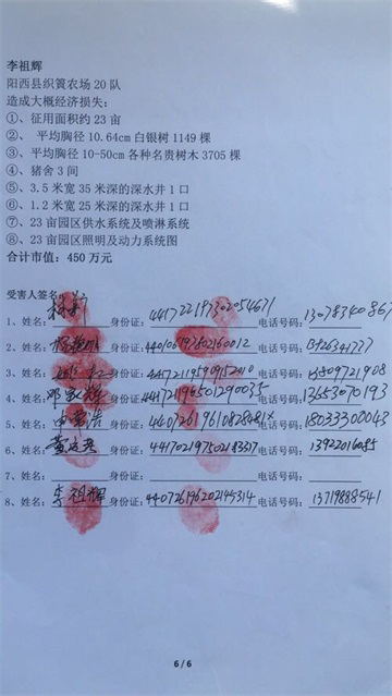 另一位遭到暴力拆迁的当事人姚某称,我在塘口镇横山村草香岭的承包地内建设了一个规模很大的种植园,种有荔枝、龙眼、罗汉松等林木。2019年3月23日深夜,阳西项目经理部韩丁、邓孝芳指派 挖掘机闯入种植园,将园内林木全部推毁(后经估算直接经济损失约200万元)。当我早上来到种植园时,种植园已被夷为平地。我当即找到施工方韩丁、邓孝芳等人质问时,邓孝芳对我推搡还要打人。我马上报警 ,邓孝芳反咬一口称是我动手打人,利用身上一处旧伤疤说胸前被我打伤。当地派出所民警出警后,居然强令我赔偿邓孝芳医药费。“韩丁等人没有任何拆迁手续就毁掉我的巨额财产,涉嫌重大犯罪!公安机关不仅不 打击,反而让我赔偿他们,这岂不是天大的笑话?我认为阳西县公安局塘口派出所涉嫌滥用职权、甚至充当黑恶势力保护伞”。