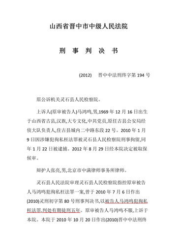 在这里有必要说明的是,由于晋中市中级人民法院对马鸿鸣“放虎归山”,为虎作伥、助纣为虐的枉法判决,不但使马鸿鸣官复原职,而且使其贪赃枉法的本性更加贪婪。特别是在党的十八大后,马鸿 鸣仍不收敛、仍不收手,于2018年再次利用他手中的权利进行贪赃枉法,人为制造冤假错案(详情见附后材料)。
