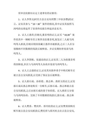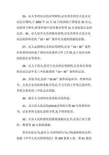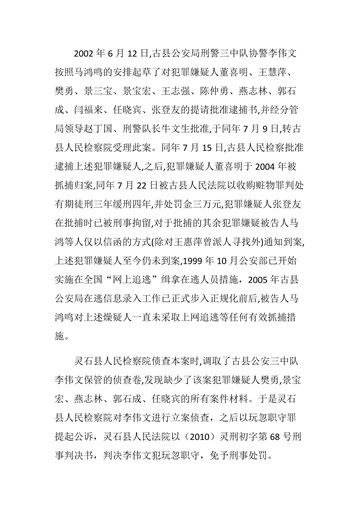 6、马鸿鸣为了贪赃!竟敢将犯罪嫌疑人樊勇、景宝宏、燕志林、郭石成、任晓宾等5人犯罪的所有案件材料销毁(判决书上的用词是缺少)。最后,让一名没有办案资格的协警李伟文做了他的替罪 羊。