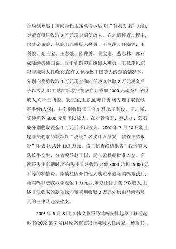 8、马鸿鸣的贪赃,仅判决书上就认定了12万元,(隐藏的受贿款肯定金额更大)。判决书上把贪赃美其名为“坐支”。(见终审判决书证据10:原古县公安局局长孟援朝的证言:“不允许自收自支”; 见证据15:古县公安局会计李玲的证言:“财务上没有马鸿鸣的报销记录”。)另外马鸿鸣还将赃车桑塔纳2000窃为己有,直至使用五年后的2005年8月2日,才被灵石县人民检察院侦破、收缴。