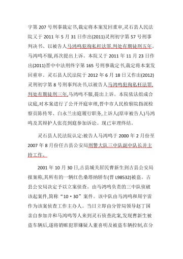 临汾市古县公安局经侦大队大队长马鸿鸣因多次贪赃枉法,被灵石县人民检察院,于2010年1月份对其刑拘逮捕。灵石县人民法院初审判决:马鸿鸣犯徇私枉法罪判处有期徒刑五年;马鸿鸣上诉后, 被晋中市中院裁定发还重审,一审法院再次判处马鸿鸣有期徒刑五年;马鸿鸣再次上诉,晋中市中院违背程序,再次发还重审,马鸿鸣被减除二年徒刑,被判处有期徒刑三年。马鸿鸣第三次提起上诉,最终晋中市中 级人民法院“力挽狂澜”,为罪责难逃的马鸿鸣“起死回生”,以(2012)晋中中法刑终字第194号判决免予马鸿鸣刑事处罚,为其恢复人身自由,使住监两年后的马鸿鸣毫发无损,官复原职,继续稳坐在古县公安局经侦 大队大队长的宝座。