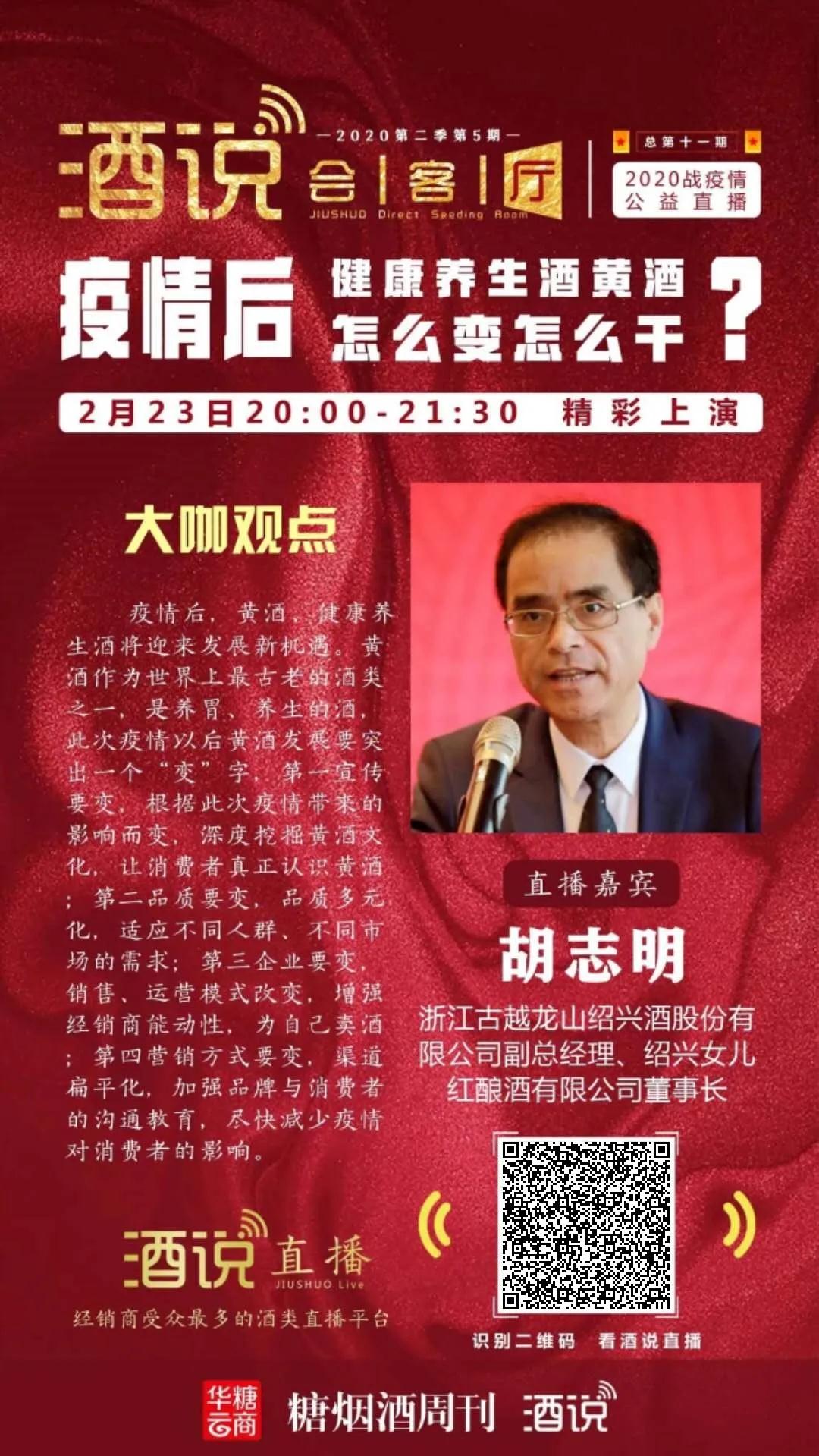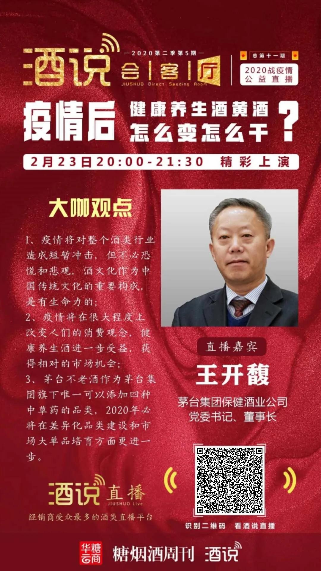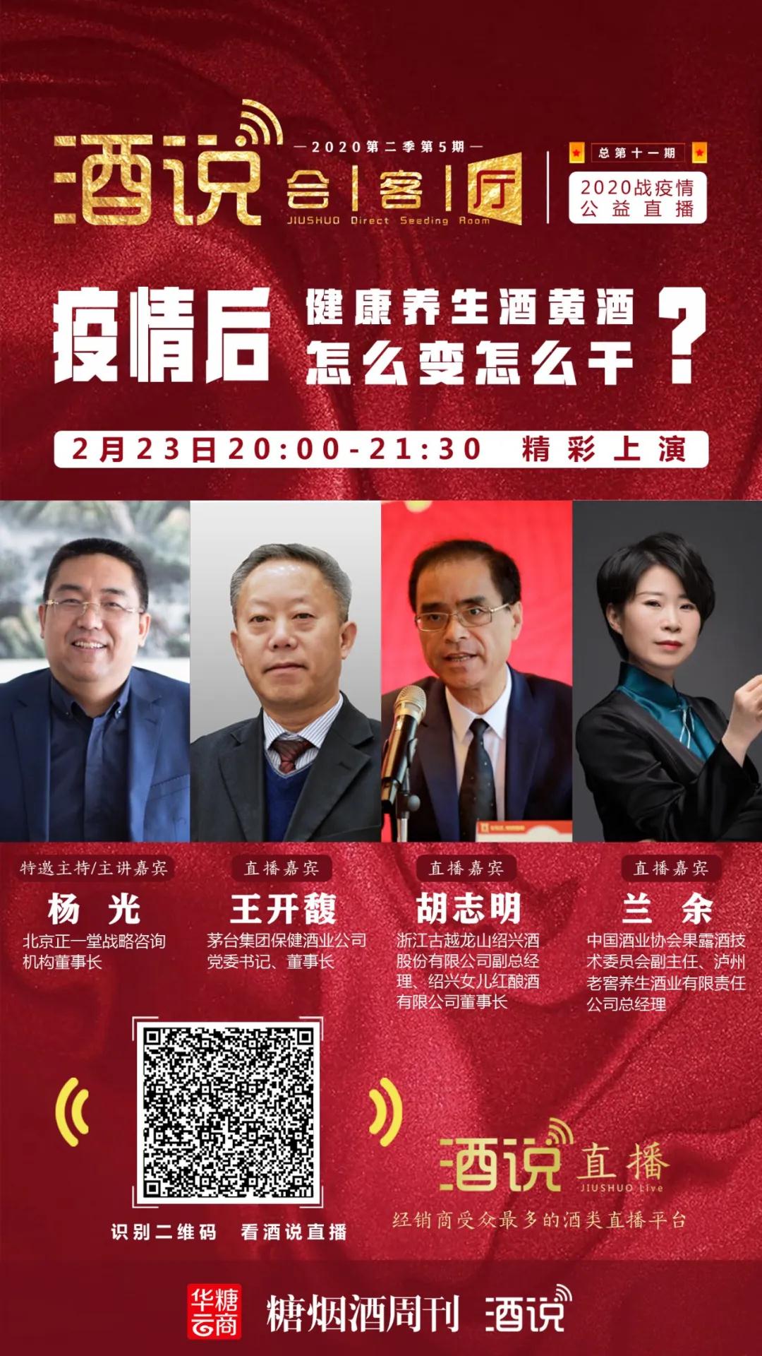 为此,酒说会客厅2月23日特别聚焦疫情下健康养生酒、黄酒品类发展,特意邀请茅台集团保健酒公司董事长王开馥,古越龙山股份公司副总经理、女儿红酒业董事长胡志明,泸州老窖养生酒业有限公司总经理兰余3位企业代表,与智业代表正一堂战略咨询机构董事长杨光,一同就疫情下黄酒、健康养生酒发展的热点话题进行探讨,并自身说法以酒企目前的营销实践提出相应的思考与建议。