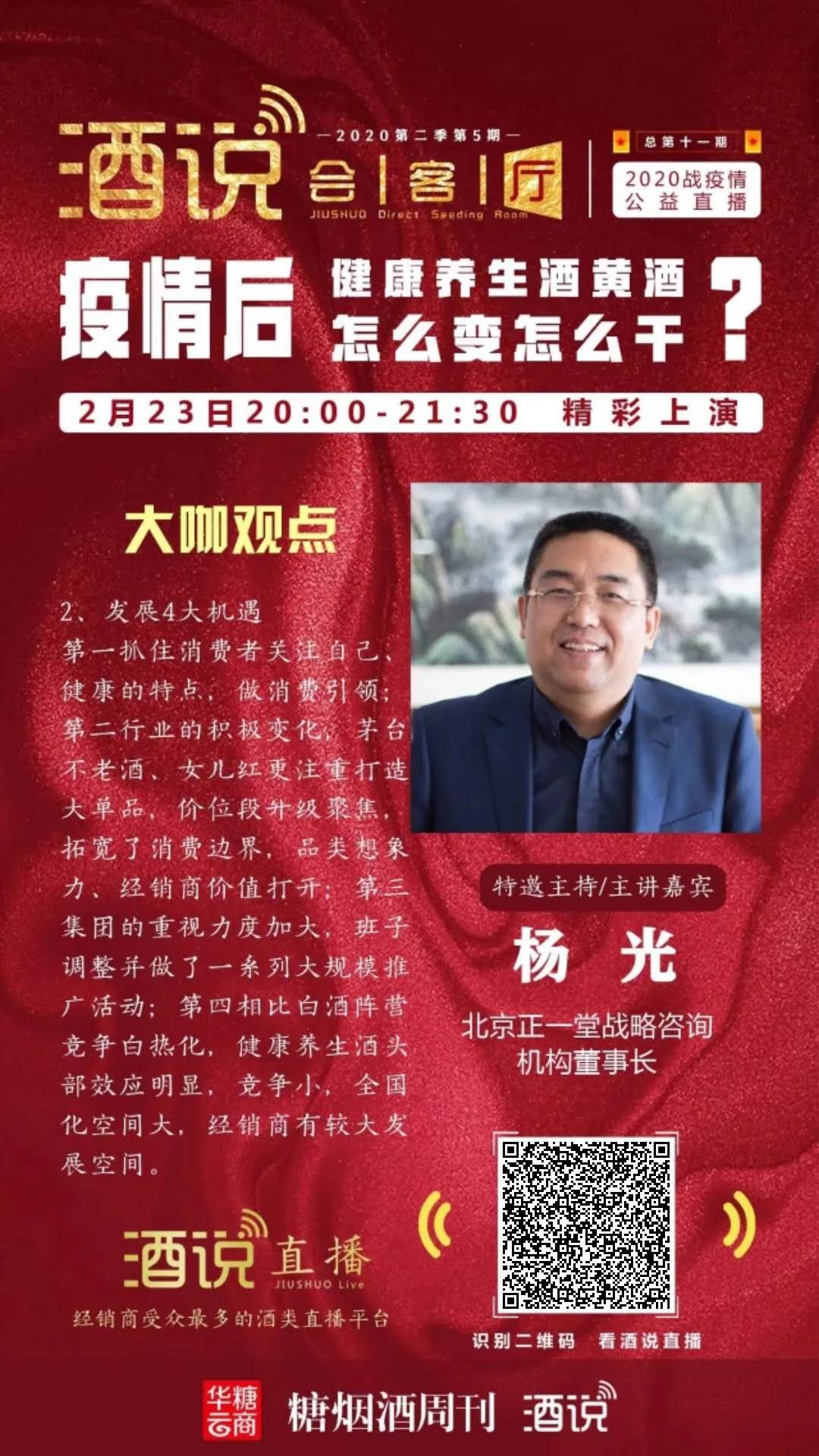 作为本期会客厅的智业代表兼主持嘉宾,北京正一堂战略咨询机构董事长杨光提出,疫情不会改变趋势,只会加快趋势,此次疫情将催生健康养生酒、黄酒品类迎来更大发展。