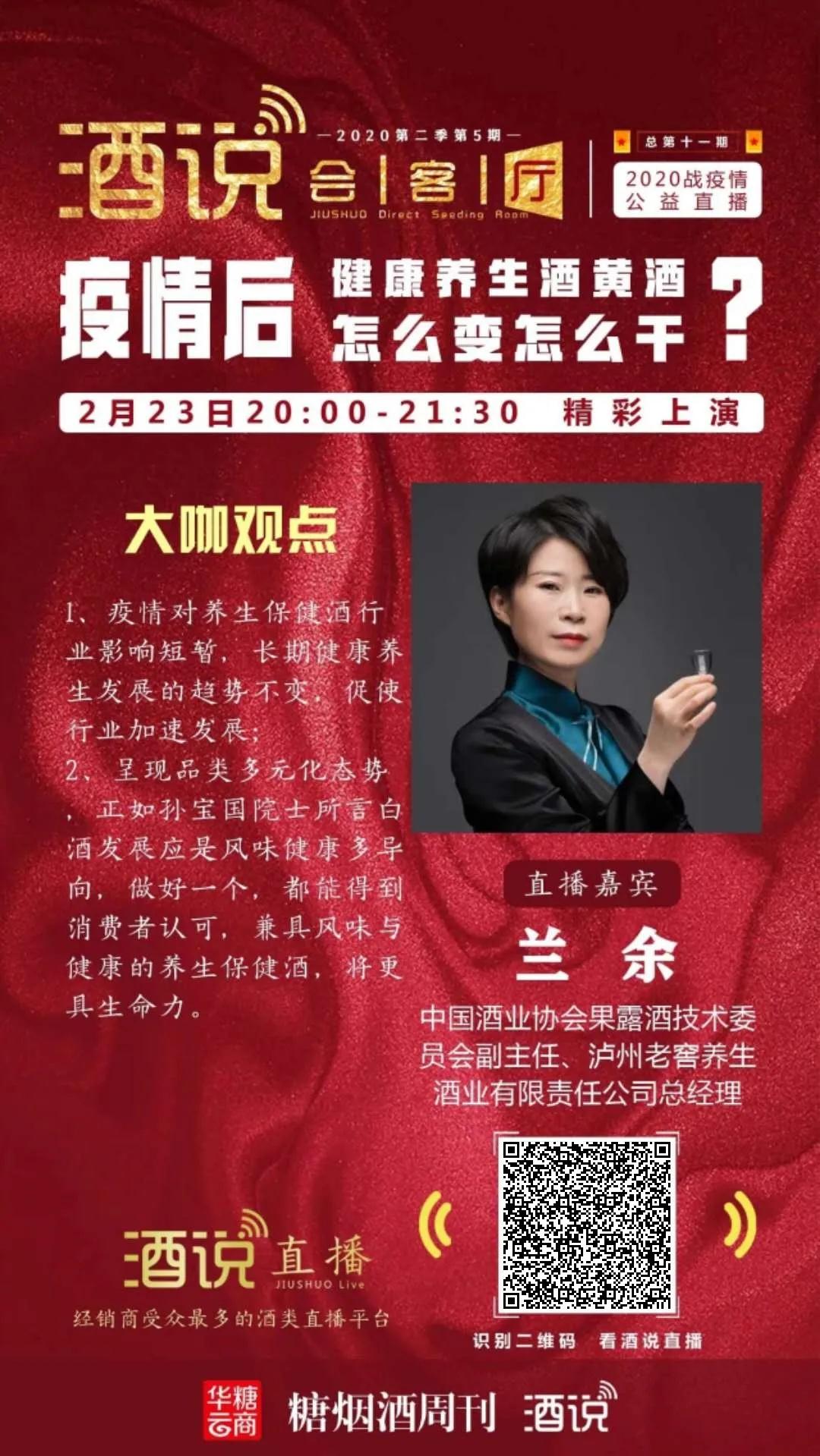 作为本次直播的女嘉宾导师,泸州老窖养生酒业有限公司总经理兰余就目前健康养生酒的发展形势进行了分析。她认为,目前健康养生酒总体规模较小,疫情对养生保健酒行业影响短暂,长期健康养生发展的趋势不变,随着消费升级,未来养生酒的市场必将有所放大。