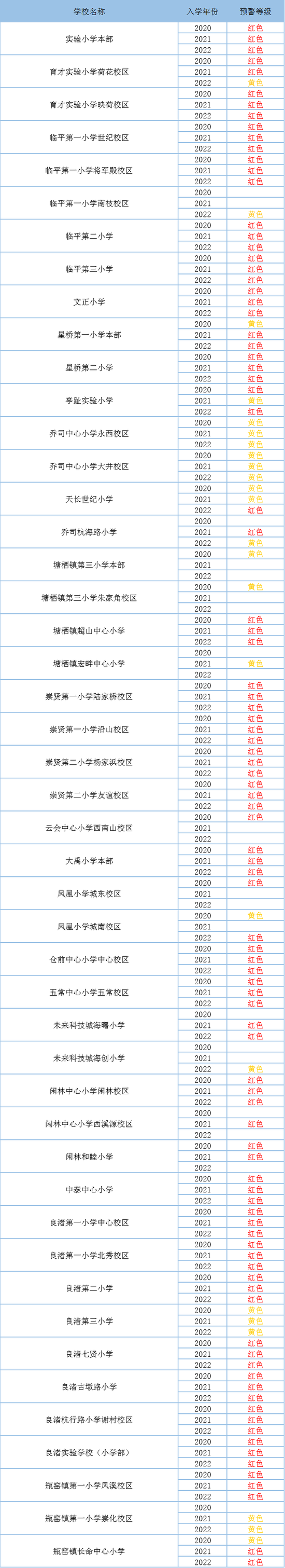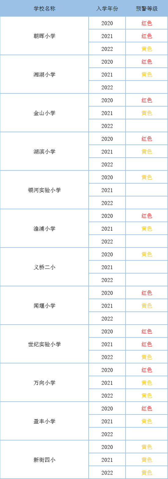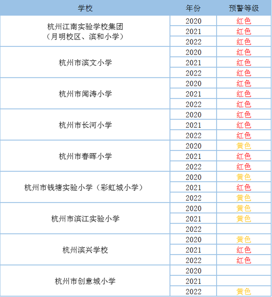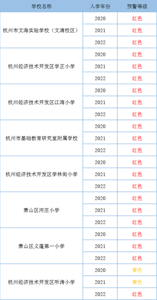 根据今年3月底各学校学区内户籍适龄儿童数及小学毕业生数,富阳区、淳安县两地没有达到预警标准的学校;下城区、滨江区、萧山区、桐庐县、建德市没有达到预警标准的初中学校。