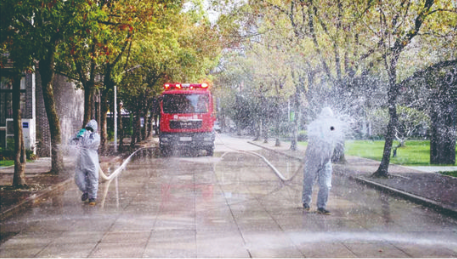 为做好学校疫情防控,助力安全有序复学,从25日起,南通市消防救援支队认真做好各大中专院校、中小学校(幼儿园)复学前的防疫消杀工作,重点对校园内的食堂、教室、办公楼等区域以及校园周边公共设施进行全面喷洒消毒作业。图为消防人员在南通一中、天生港小学等学校消杀作业。